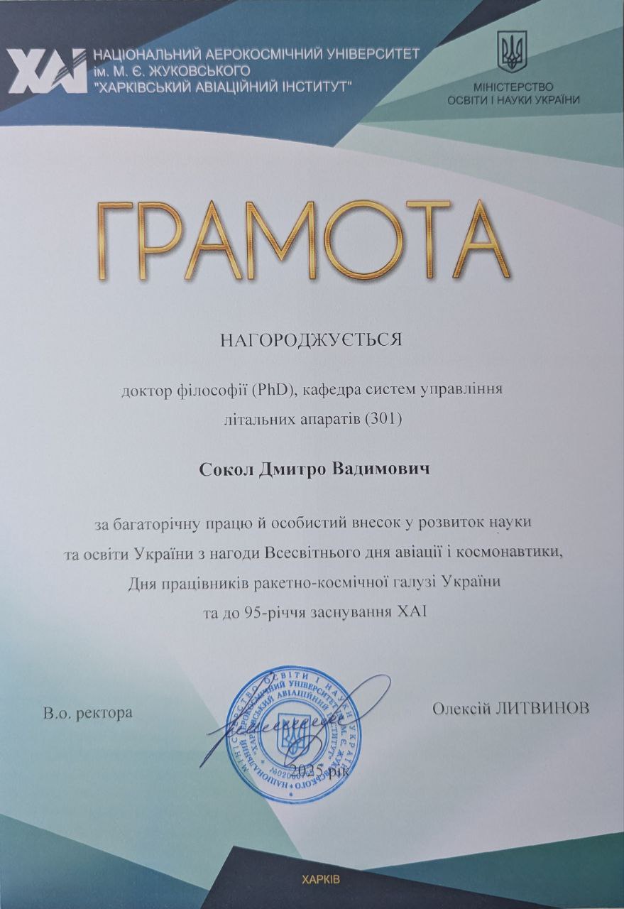 17 квітня 2025 року з нагоди 95-річчя ХАІ та Всесвітнього дня авіації та космонавтики, за багаторічну працю й особистий внесок у розвиток науки та освіти України нагороджено доцента кафедри Дмитра Сокола. Вітаємо Дмитра та бажаємо подальших успіхів!